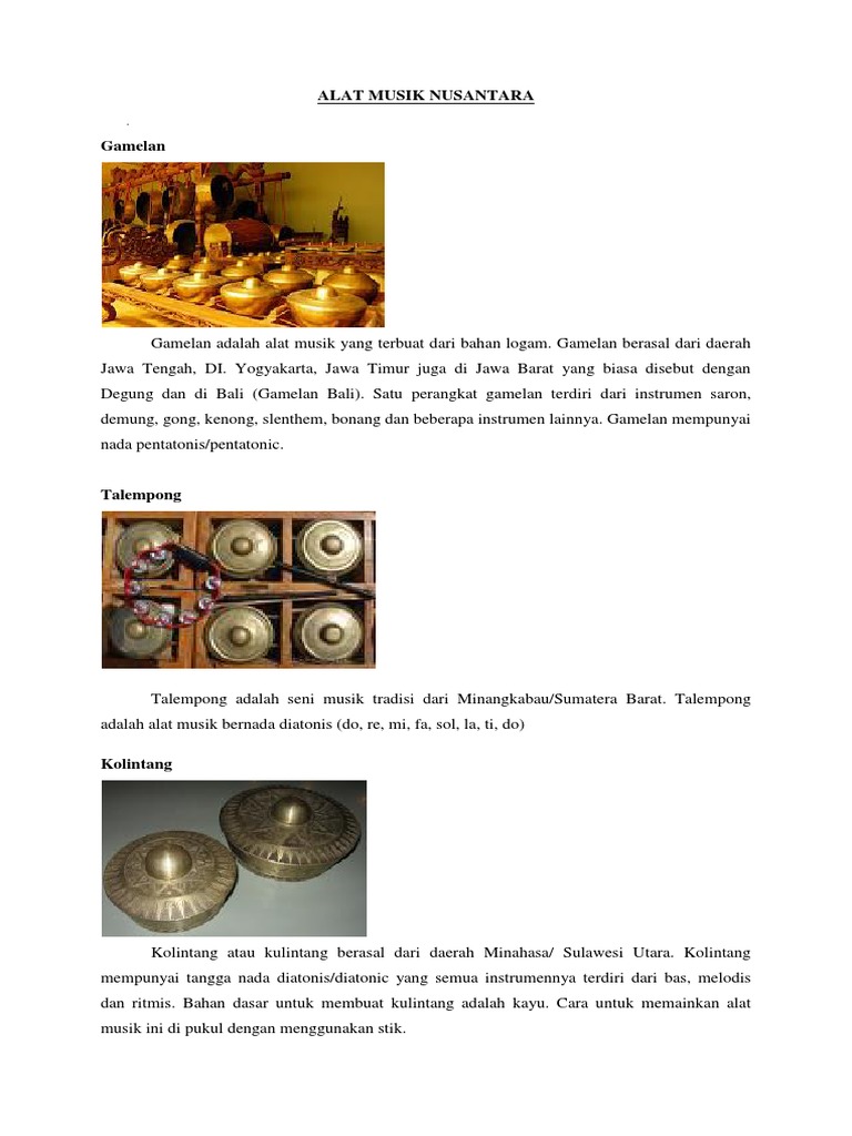 Selain itu, kolintang adalah alat musik tradisional yang dekat dengan kebudayaan warga melayu di indonesia. Keberadaannya harus mendapat perhatian banyak orang, khususnys mereka yang bergelut didunia seni, baik seni musik dan seni tari. Bende adalah alat musik tradisional indonesia yang berasal dari daerah lampung. Garantung adalah alat musik tradisional dari provinsi sumatera utara yang tepatnya ada daerah selain untuk pengiring melodi, garantung terkenal juga sebagai penstabil ritme variable di setiap balobat adalah alat musik tradisional suku karo dari sumatera utara yang menyerupai seling dan. Pada badan salude terbuat dari satu ruas bambu dengan dua buah dawai. Kolintang adalah salah satu alat musik tradisional masyarakat minahasa di sulawesi utara. Alat musik ini biasa dipakai sebagai pengiring tarian tradisional oleh masyarakat. Selanjutanya adalah alat musik yang berasal dari daerah minangkabau sumatera barat yakni saluang. Alat musik tradisional sulawesi utara yang ini memiliki nama salude dan dimasukkan kedalam alat musik idokardofon. Cara menggunakan serangko adalah dengan ditiup. Cara menjaga sistem kekebalan anak selama. Bende merupakan salah satu alat musik perkusi kulintang dari daerah lampung yang memiliki bentuk mirip dengan alat musik kempul/gong pada gemelan di daerah jawa tengah. Alat musik tradisional merupakan alat musik daerah yang berkembang secara turun temurun.