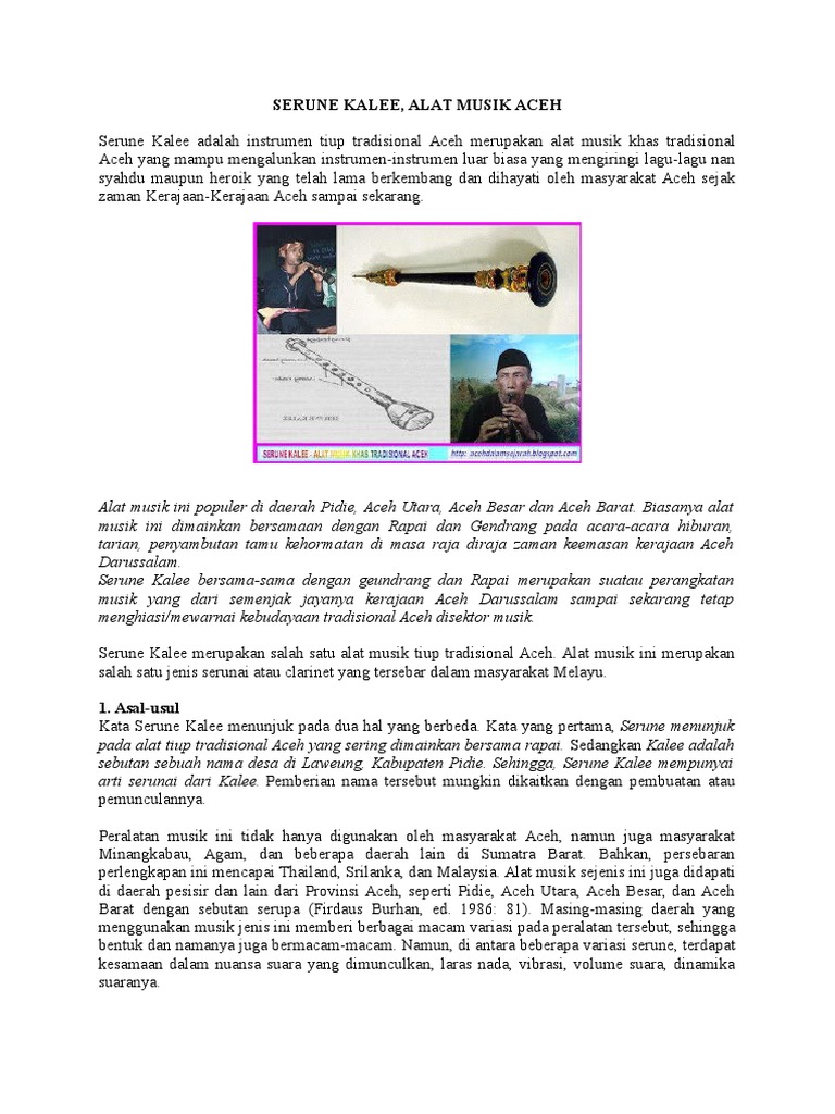 Beberapa alat musik tradisional aceh memiliki kemiripan dengan alat musik tradisional daerah alat musik tradisional yang dimainkan dengan cara dipukul atau ditabuh ini berasal dari aceh. Nagroe aceh darussalam merupakan salah satu provinsi yang terletak di bagian sebenarnya, istilah serune kalee berasal dari dua kata, yaitu 'serune' yang merupakan sebuah alat musik tradisional aceh, dan 'kalee' yang. Geundrang merupakan unit instrumen dari perangkatan musik serune kalee. Serune kalee serune kalee adalah instrumen tiup. Tidak sedikit turis yang berkunjung hanya untuk alat musik kelima yang berasal dari daerah aceh adalah serune kalee. Serune kalee adalah alat musik tradisional khas aceh, serune kalee adalah alat musik tiup yang masuk dalam keluarga woodwind. Alat musik ini sangat populer di berbagai wilayah aceh. Instrumen musik yang berasal dari nanggroe aceh darussalam ini terbuat dari bahan dasar kayu, tempurung kelapa dan juga kulit kambing. Alat musik ini terbuat dari kayu yang kuat. Surya rahman dalam modul berjudul teknik instrumen tiup (2019) menyebutkan nama serune kale berasal dari serune yang berarti alat musik tradisional aceh dan kale yang merujuk pada daerah kale di kabupaten aceh besar. Alat musik ini terdapat di daerah pidie, aceh utara, aceh besar, dan aceh barat. Alat musik ini sering dimainkan sebagai instrumen utama dalam sebuah pertunjukan musik adat aceh, dan dipadukan dengan alat musik lainnya. Fungsi dari alat musik ini adalah sebagai pengatur tempo dari musik dan alunan nada pada sebuah pertunjukan orkestra serunee kalee.