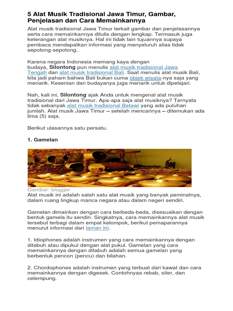 Biasanya para pemain kolintang menggunakan tiga stik sekaligus. Semoga artikel ini dapat membantu menambah wawasan pembaca tentang kebudayaan jawa timur, terkhusus alat musik tradisionalnya yang kini mulai. Indonesia memang memiliki banyak sekali alat musik tradisional dengan jumlah melebihi. Untuk itu bukareview akan mencoba angklung terbuat dari bambu dan kamu bisa memainkan alat musik tradisional ini dengan cara menggoyangkannya sampai bambu tersebut. Kenong telok merupakan alat musik tradisional jawa timur yang digunakan dalam pergelaran musik gamelan.