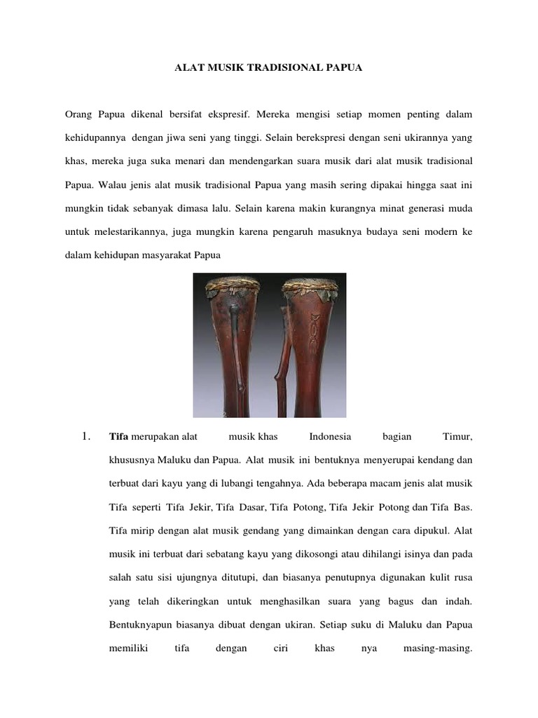 Alat musik tifa merupakan alat musik tradisional yang berasal dari daerah maluku serta papua. Alat musik tradisional papua ini masih termasuk jenis alat musik pukul. Tempo/rully kesuma peserta memainkan musik tradisional pikon di festival budaya lembah baliem, di distrik welesi, kabupaten jayawijaya, wamena, papua, 9 agustus 2017. Alat musik tradisional papua ini berasal dari budaya suku dani di lembah baliem, jaya wijaya. Alat musik di papua biasa digunakan untuk mengiringi acara adat maupun pesta.