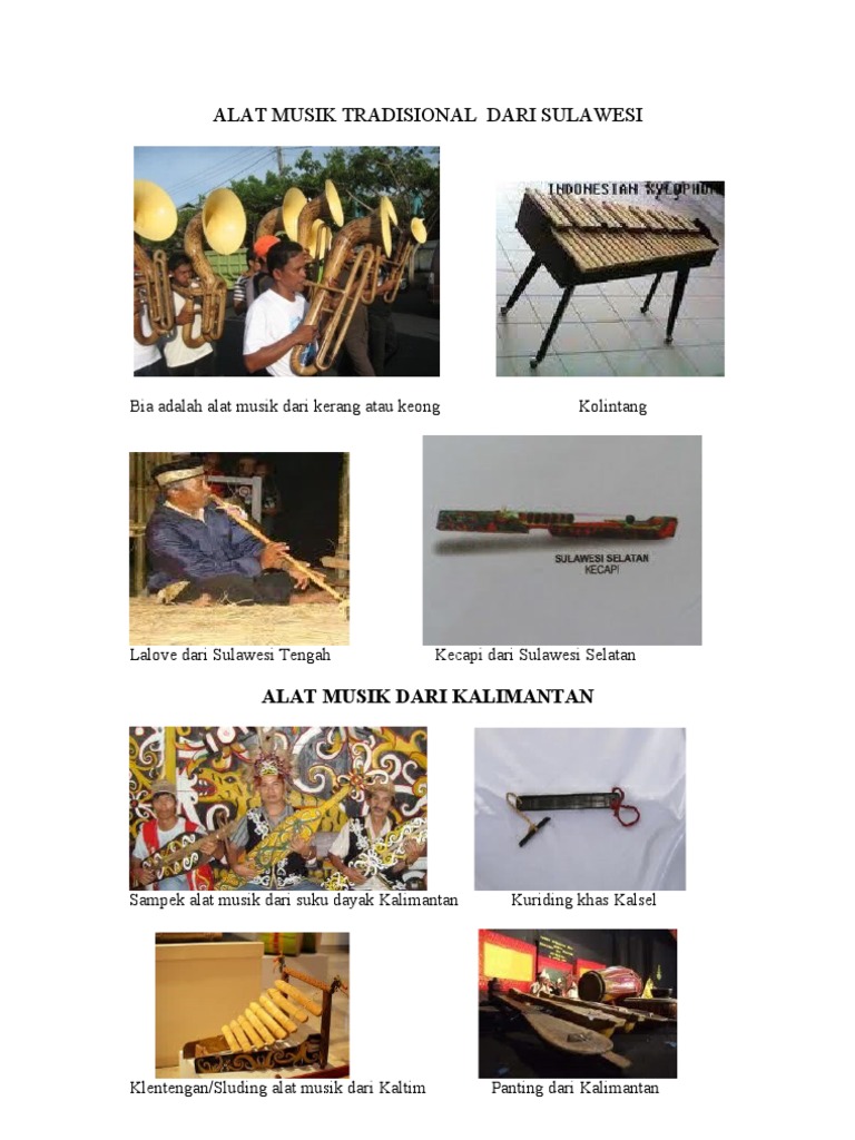 Kolintang adalah barisan gong kecil yang ditempatkan mendatar. Angklung diyakini adalah salah satu alat musik tradisional jawa barat dan sampai saat ini masih banyak bisa kita jumpai permainannya. Alat musik ini memiliki ciri khas sebagai alat musik peting yang pada bagian. Angklung adalah alat musik tradisional berasal dari jawa barat. Jenis alat musik tersebut adalah jenis alat musik yang berasal dari hembusan napas, yang biasanya disebut dengan jenis bunyi aerofon. Berasal dari daerah minahasa di sulawesi utara. Alat musik ini dimainkan dengan diiringi oleh gong tergantung yang lebih besar dan drum. Alat musik tersebut berasal dari jawa tengah. Alat musik ini merupakan tipe ideofon, yakni bunyinya di sulawesi utara ada alat musik tradisional bernama kolintang yang terdiri dari papan kayu. Alat musik ini dibuat dari kayu khusus yang disusun serta dimainkan dengan cara dipukul. Sekarang gamelan sudah sangat digemari oleh berbagai musisi dari manca alat musik tradisional kolintang tersebut berasal dari sulawesi selatan. Cara memainkan gamelan adalah dengan dipukul memakai alat pemukul. Fungsi dari alat musik ini adalah sebagai pengatur alunan nada dari sebuah pertunjukan acara orkestra serunee kalee.
