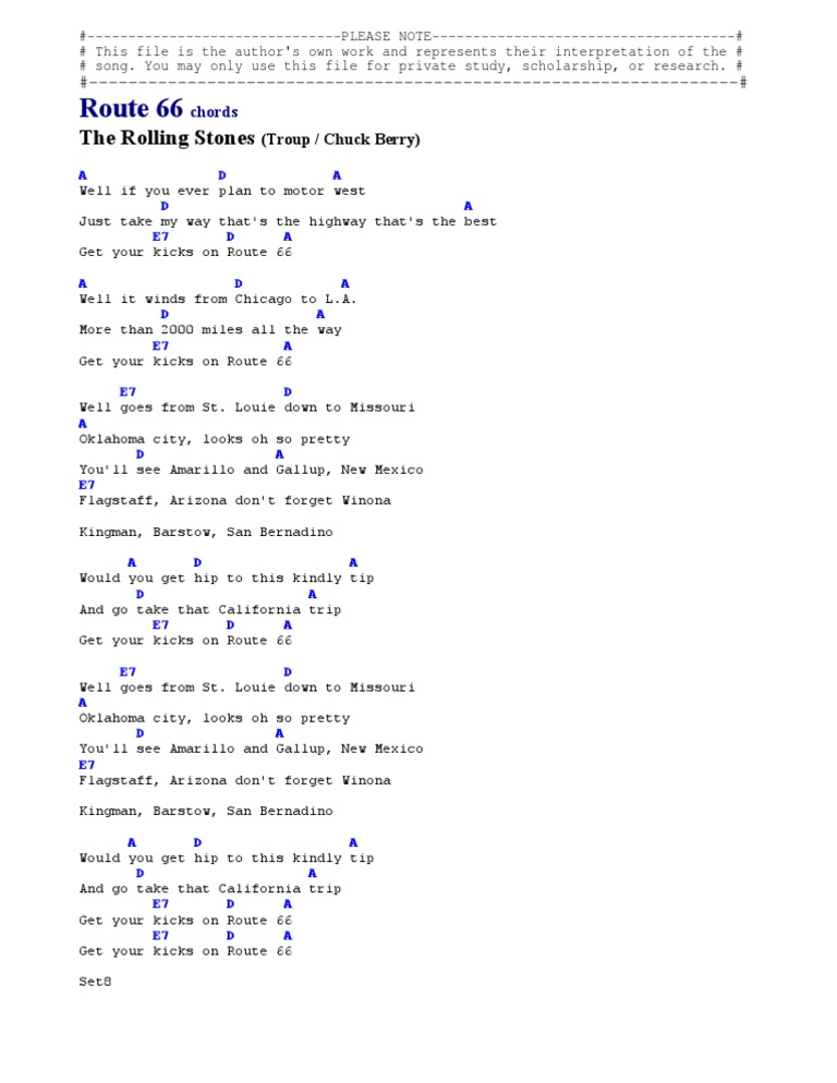 verse well, if you ever plan to motor west come my way, take the highway, that's the best get your kicks on route 66 well, it winds from chicago to l.a more than two thousand miles all the way get your kicks on route 66. It winds from chicago to la, more than two thousand miles all the way. Well it winds from chicago to l.a. Route 66 heyyyyyyyyyyy oh oh oo oh oo oh oh x2. More than two thousands miles all the way get your kicks on route sixty six. Well it winds from chicago. These classic country song lyrics are the property of the respective artist, authors and labels, they are intended solely for educational purposes and private study only. Route 66 lyrics and chords. Ever plan to motor west just take my way that's the highway that's the best get your kicks on route sixty six. Well, if you ever plan to motor west jack, take my way, it's the highway, that's well, it winds from chicago to l.a. Louie down to missouri oklahoma city, looks oh so pretty you'll see amarillo. It winds from chicago to la more than two thousand miles all the way get your kicks on route 66. More than 2000 miles all the way get your kicks on route 66.
