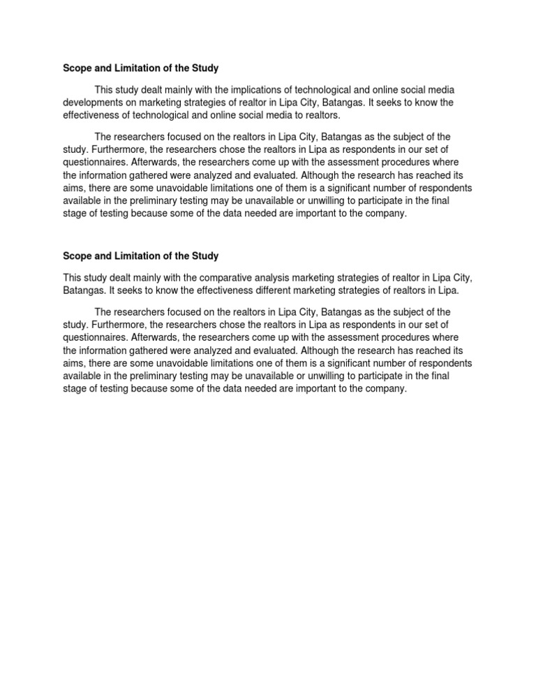 Qualitative Research Paper Chapter Scope And Delimitation Example. Indeed, there is increasing sentiment among educators that student conduct is just as important to teach as traditional content areas, for example, reading, and math. Research usually limited in scope by sample size, time and geographic area. Understanding delimitation in research papers. The proposed research firstly focuses on the telecom industry with specific reference to mobile phones. The scope of a study explains the extent to which the research area will be explored in the work and specifies the parameters within which the study will be operating.